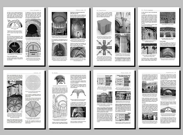Índice: Introducción · Contexto histórico · Origen · Proyecto de la obra · Talleres de construcción · Planificación e inicio · Fundamentos de la arquitectura románica · Muros · Arcos y sus soportes · Bóvedas · Techumbres de madera · Partes de la iglesia románica · Cabecera y cripta · Cuerpo de naves · Cimborrio · Campanario · Cuerpo occidental · Galería porticada · Puertas · Vanos de iluminación · Plantas y alzados · Monasterios y su arquitectura · Románico Lombardo · Románico del Serrablo · Románico Internacional Pleno · Románico Internacional Tardío · Románico de Ladrillo · Arquitectura civil · Arquitectura militar · Reflexiones finales · Glosario e Índice general.
