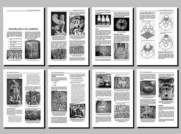 Índice: El simbolismo románico · Las religiones · El simbolismo de los números · El simbolismo de la geometría · En busca del templo simbólico · El simbolismo de las estructuras arquitectónicas · Introducción a la escultura y a la pintura · Teofanías · La Virgen María · Pasajes del Antiguo Testamento · Pasajes de los Evangelios y de los Hechos de los Apóstoles · Pasajes del Apocalipsis · Otros temas religiosos · Varios temas simbólicos · Temas profanos · El bestiario · El bestiario real · El bestiario fantástico · Motivos vegetales y geométricos · Índices.